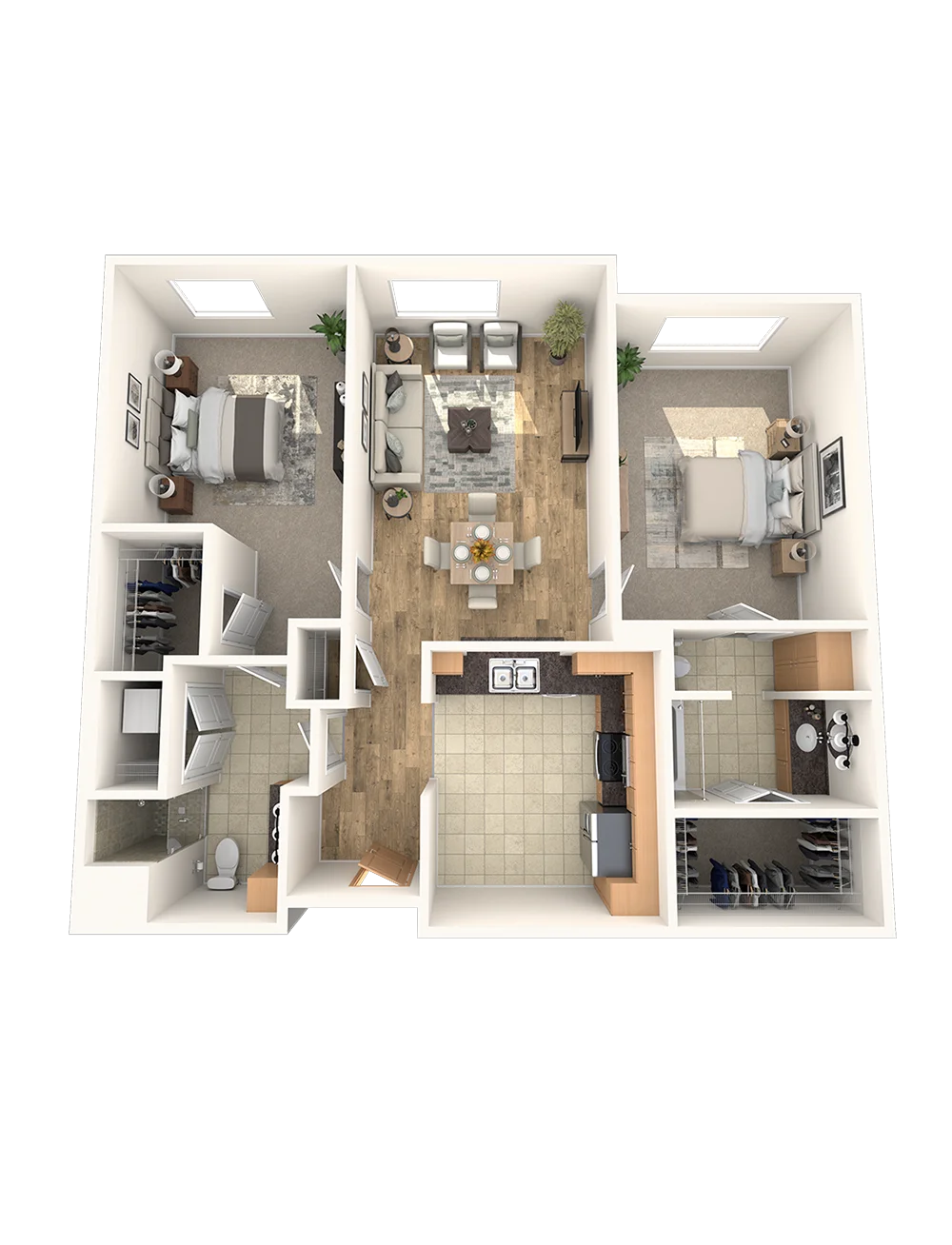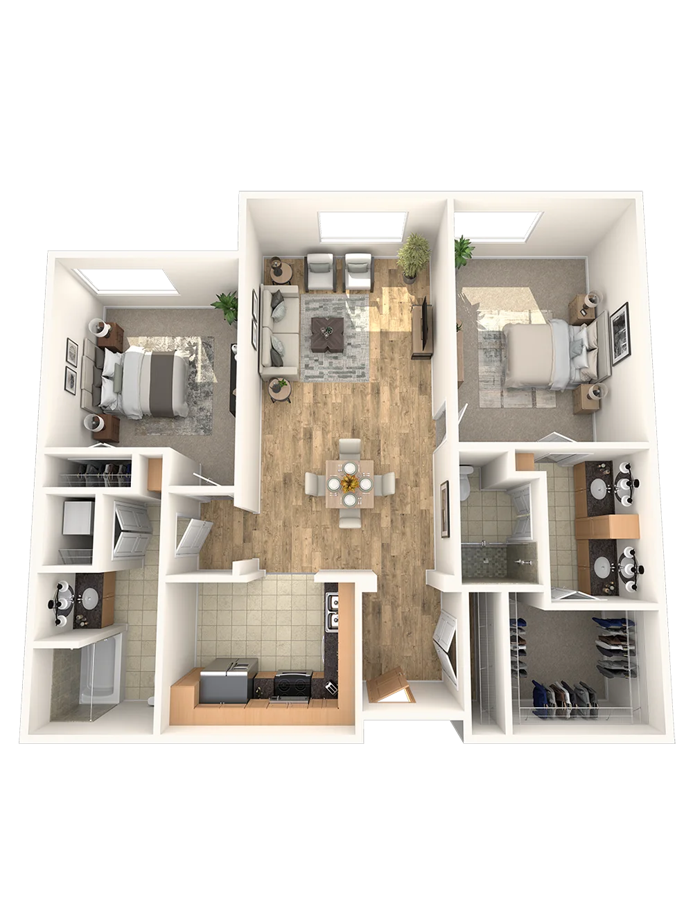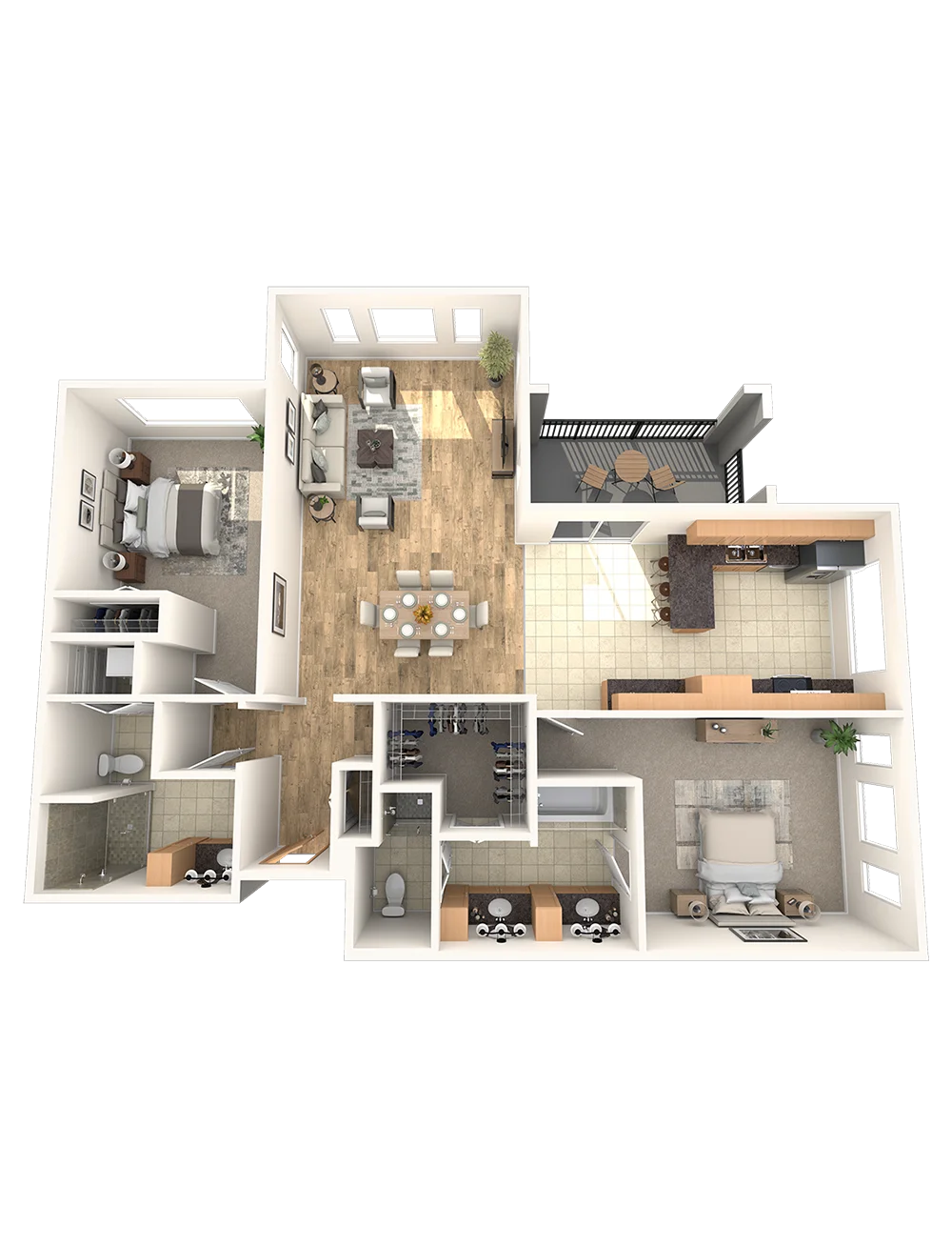 Discover the ideal oasis in the Capote, which boasts a luxurious master bedroom complete with an en suite bathroom, walk-in closet, and access to a private terrace. The second bedroom is equally spacious, with its own walk-in closet and bathroom. The living and dining areas are open, creating a harmonious layout.