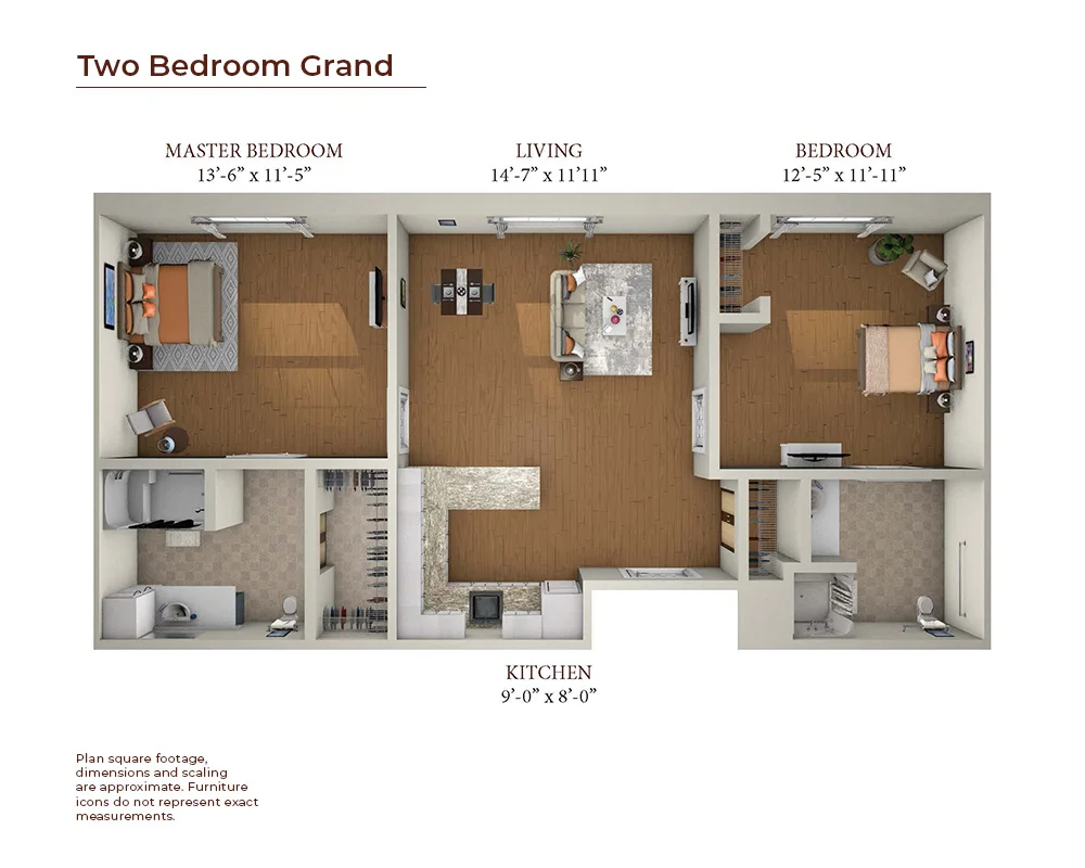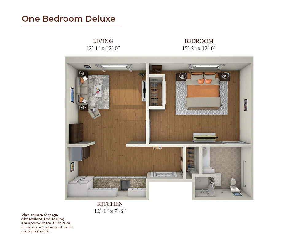 The One-Bedroom Deluxe includes a galley kitchen with full-sized appliances and a sun-drenched living area. The large bedroom has plenty of storage space and a private, accessible ensuite bathroom.