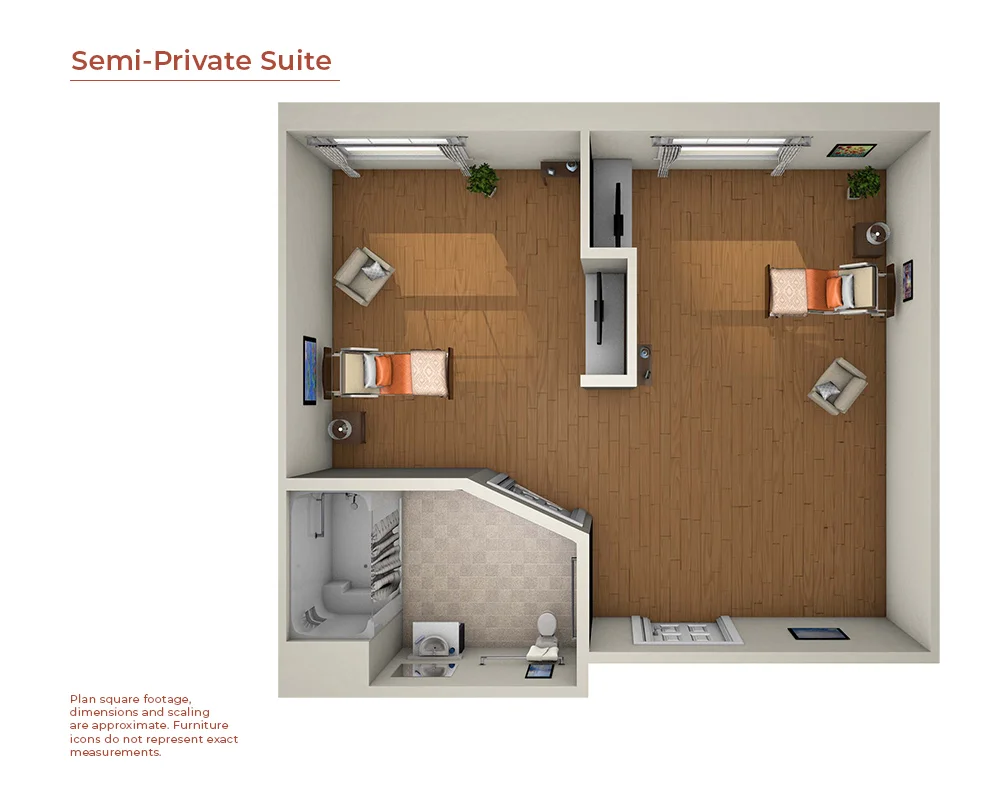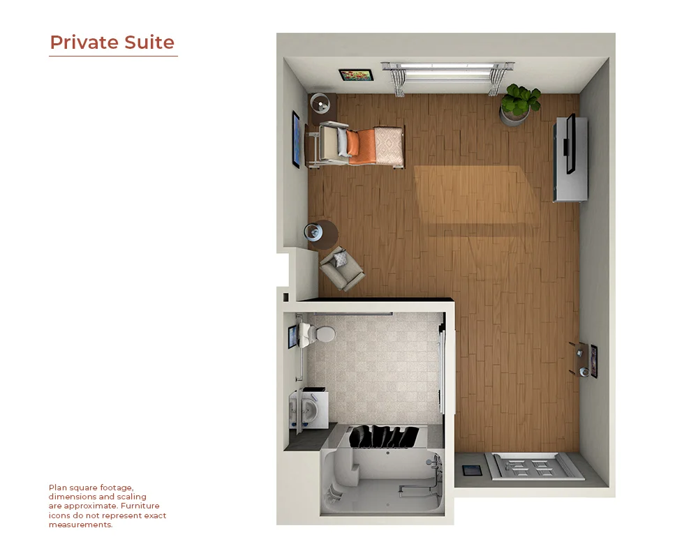 Your loved one will reside in perfect comfort in a suite built to suit their needs, which includes an accessible private bathroom, entertainment center, and area for visitors.